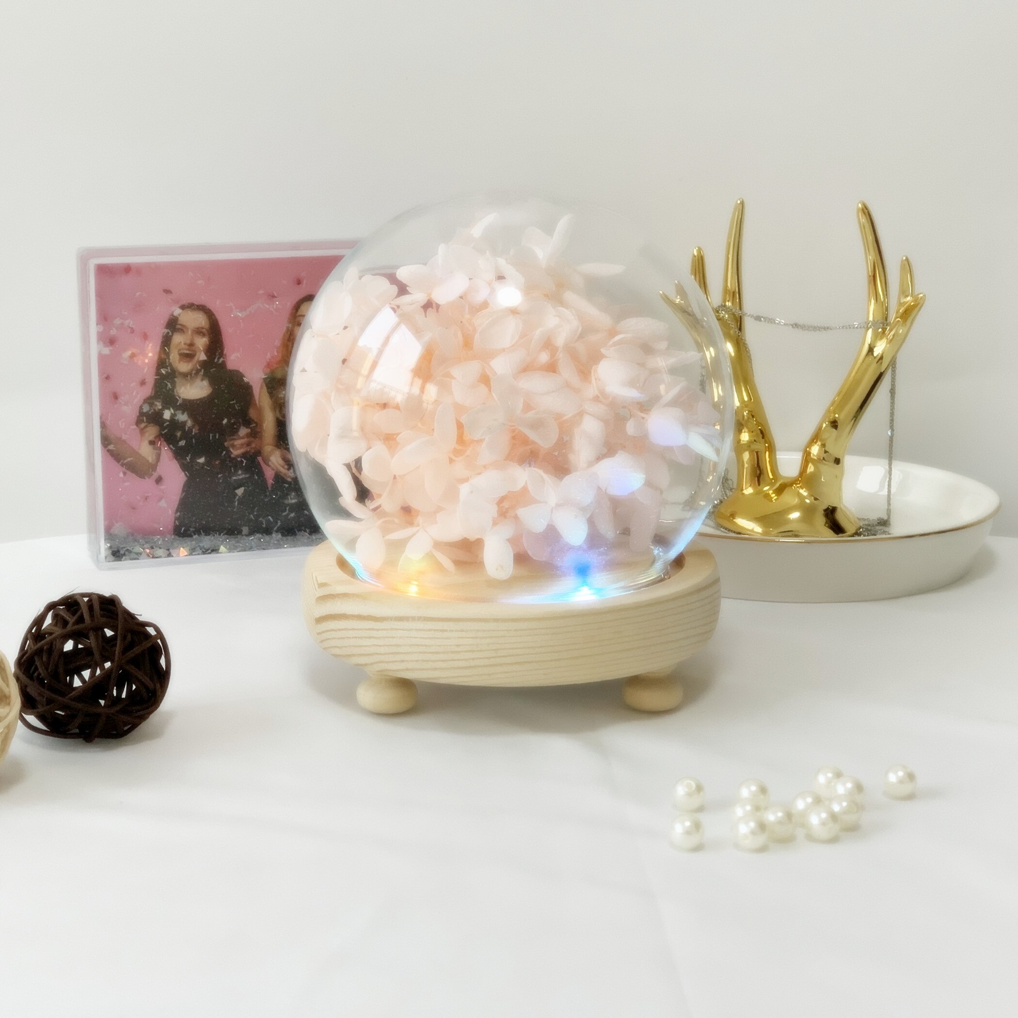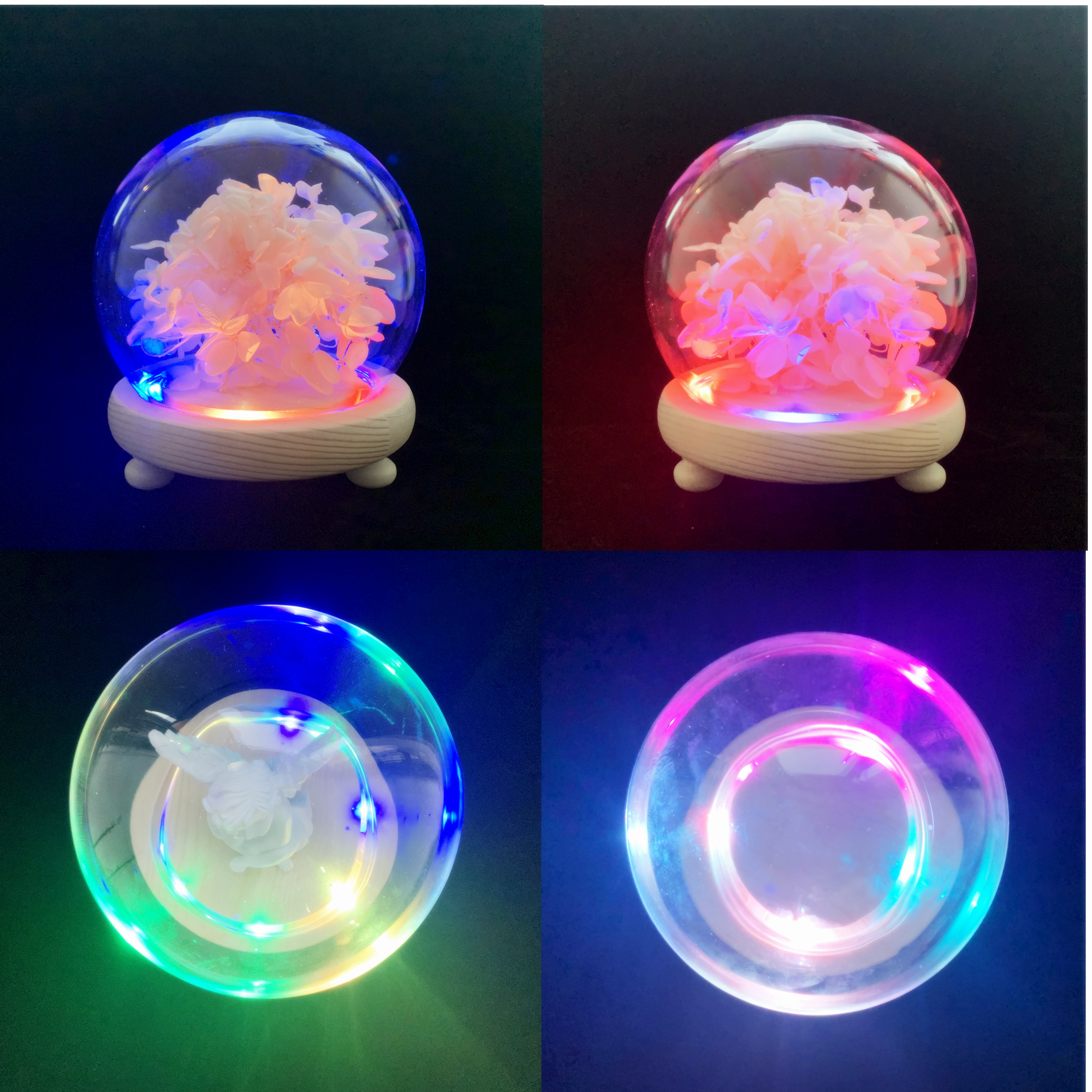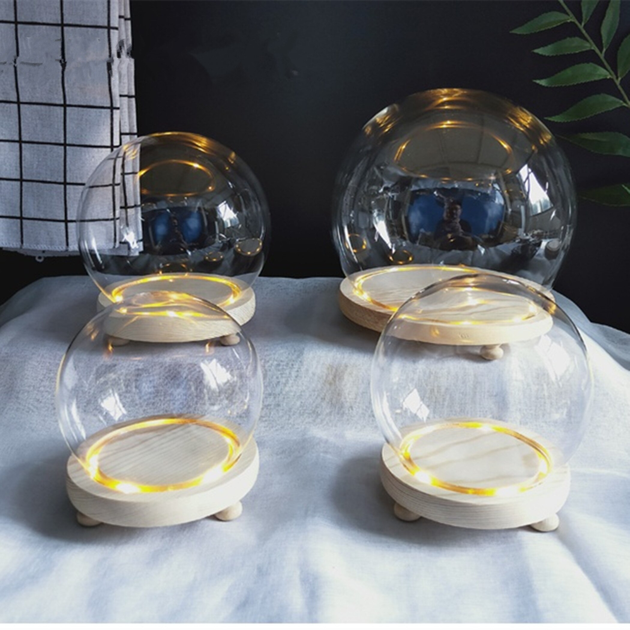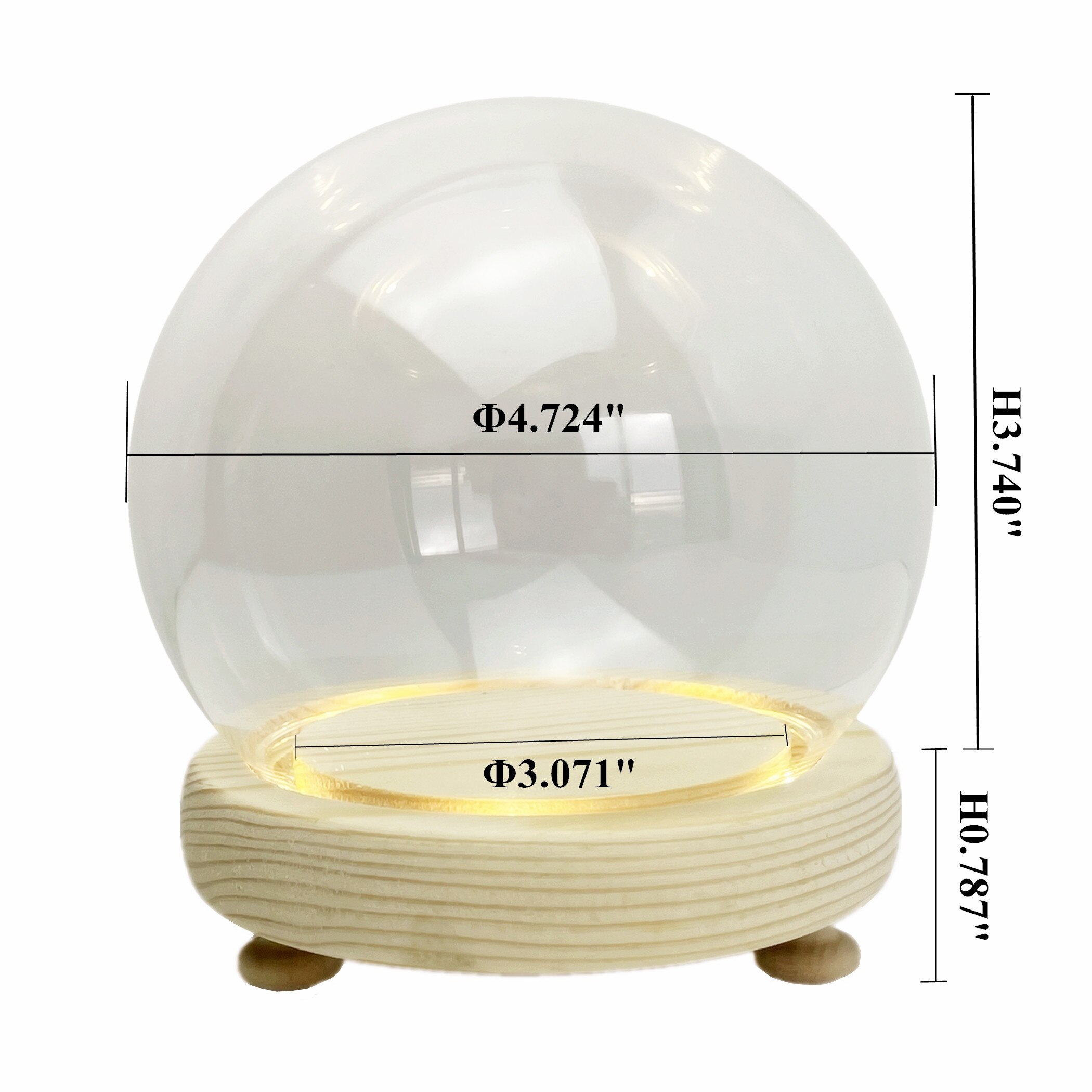 DIY Glass Snow Dome with LED light Promotional hand model dust cover Display dome with wooden base Birthday ornament