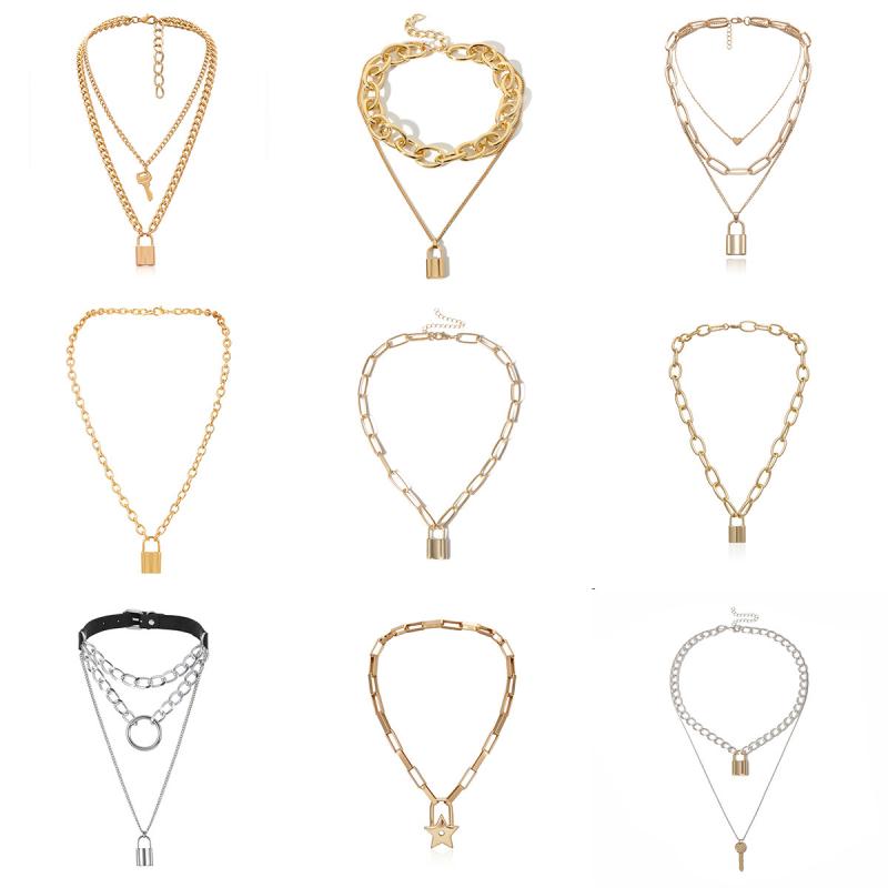 Double-layer Alloy Chain Double-layer Collar Simple Concentric Lock Key Element Pendant Necklace Femal